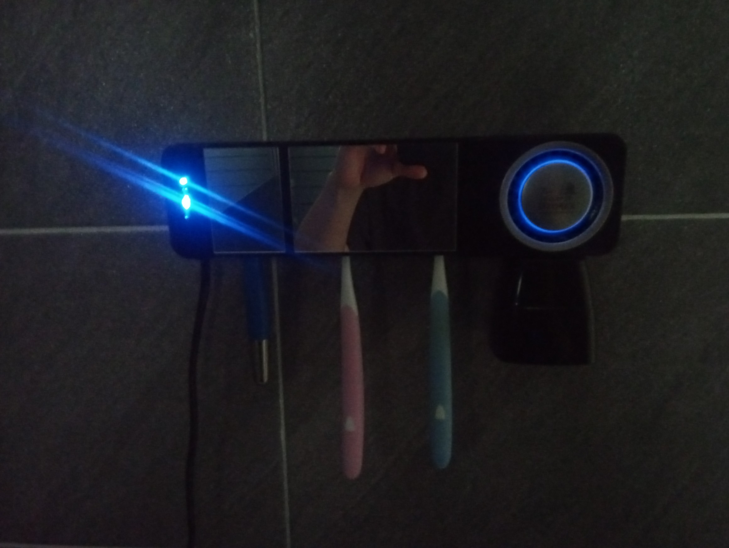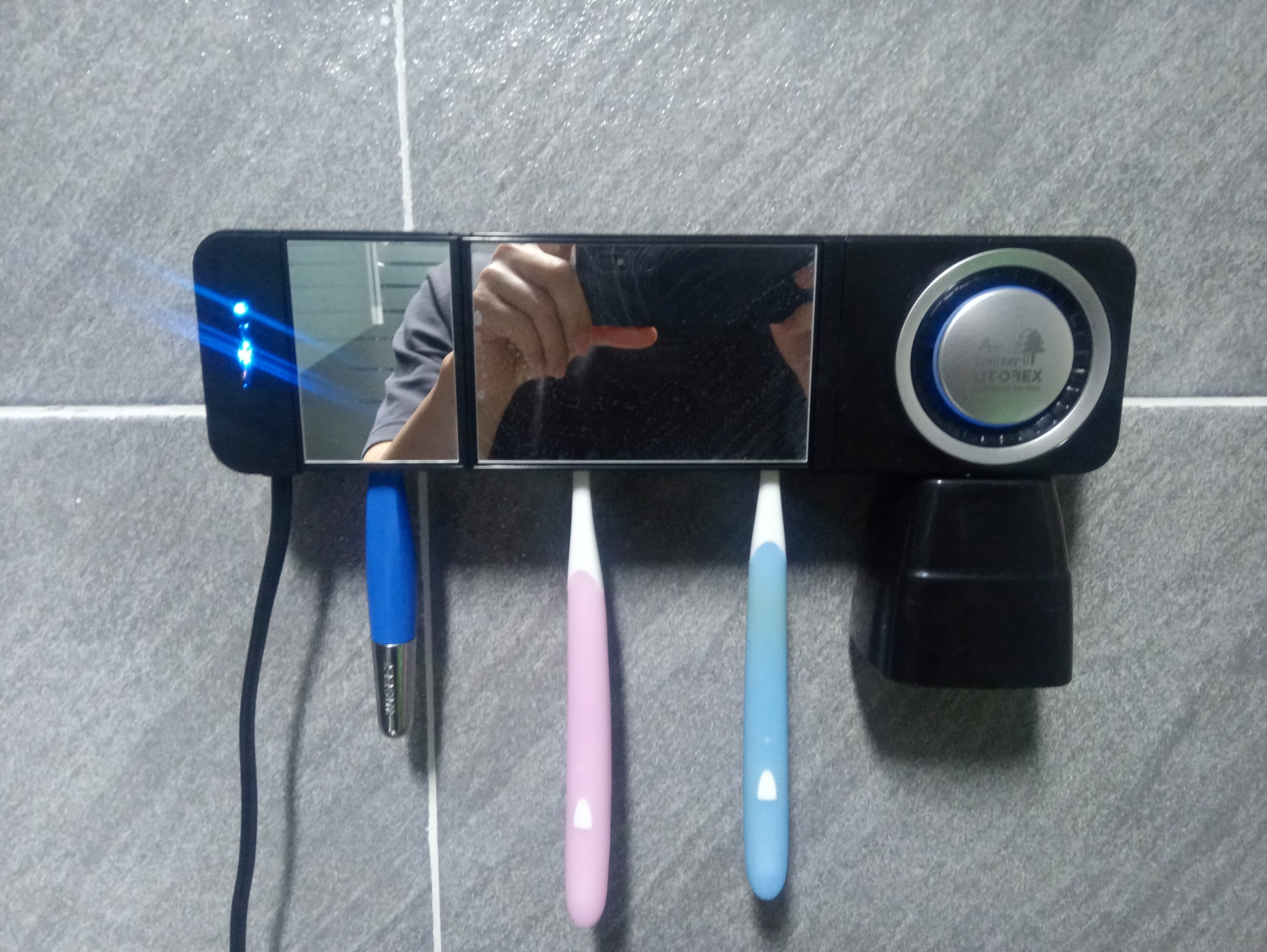 칫솔 살균기에 꽂혀있는 칫솔로 양치를 했습니다.